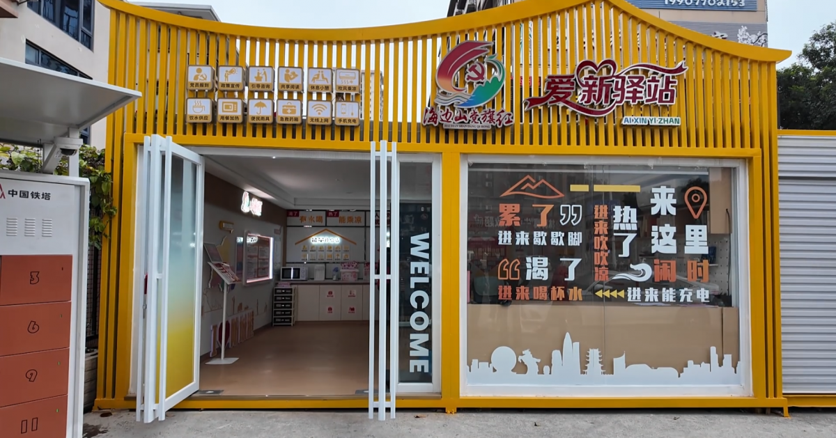 防城港市港口区迎宾街永福路口“海边山党旗红”爱“新”驿站,为骑手、司机、市民提供换电、求职、休憩服务。防城港市融媒体中心供图