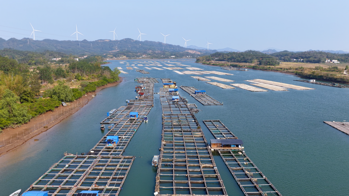 防城港市防城区茅岭镇美丽村标准化网箱整齐排列。防城港市融媒体中心供图